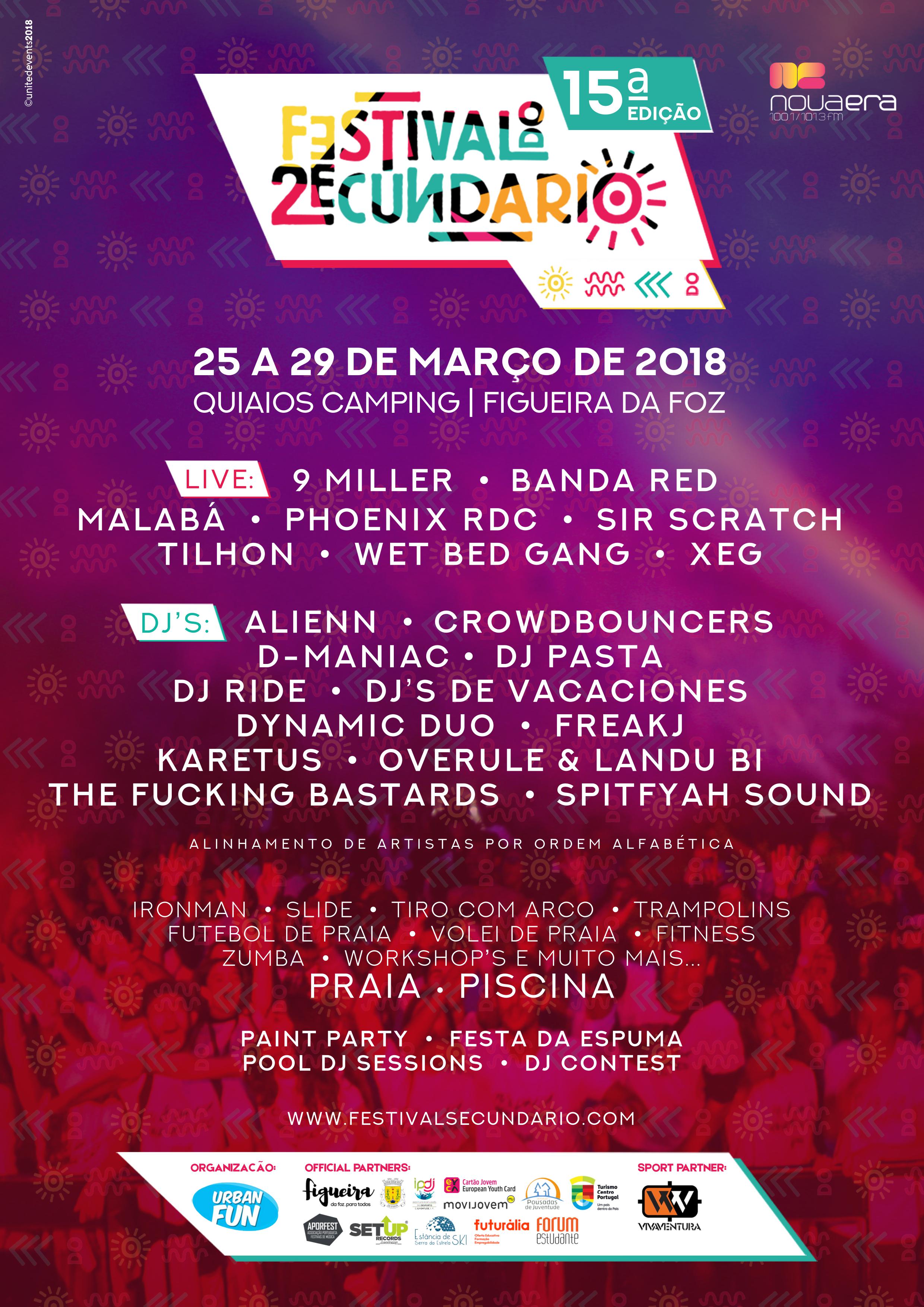 | 15.ª Edição do Festival do Secundário decorre no Parque de Campismo de Quiaios, entre 25 e 29 de março de 2018 |